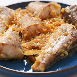 Белая рыба часто нуждается в соусе, который подчеркнет ее текстуру и не перебьет вкус. В этом рецепте используется большое количество лука, который в процессе приготовления становится мягким и насыщенным. Соус получается густым, сладковатым и обволакивающим. Рыба при этом остается нежной и сочной.