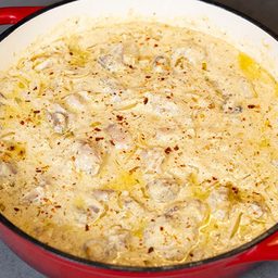 Куриное филе после термической обработки становится сухим и волокнистым, теряя свой естественный сок. Проблему решает соус, но и он должен быть особенным: к курице лучше всего подходит сливочно-чесночный вариант — почти такой же в Грузии делают для шкмерули. Филе томится в нем на медленном огне, что делает структуру мяса невероятно нежной, сравнимой по мягкости со сливочным маслом. Блюдо получается густым и наваристым, что делает его отличным выбором для тех, кто предпочитает сытную и понятную домашнюю еду. ...
