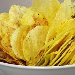 Абсолютно все магазинные чипсы содержат чрезмерное количество усилителей вкуса и масла. Домашние получаются совсем другими, делаются они из обычного пюре и без лишнего жира. Достаточно чуть прогреть их в духовке, на разных противнях, и можно сразу подавать их к столу.