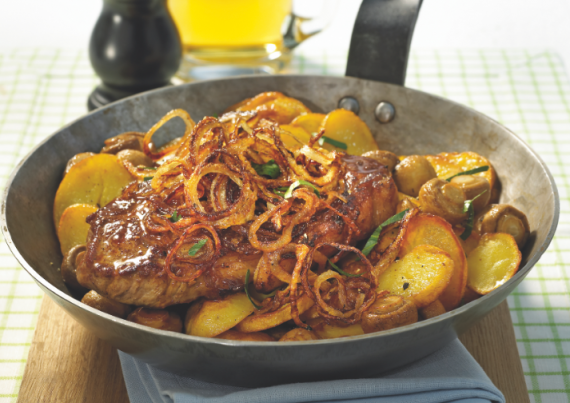 4. В оставшемся от приготовления мяса жире обжарьте до хрустящей корочки лук. Стейки с луком, картофелем и шампиньонами выложите на тарелку, на шампиньоны капните сметаной, посыпьте оставшейся петрушкой.