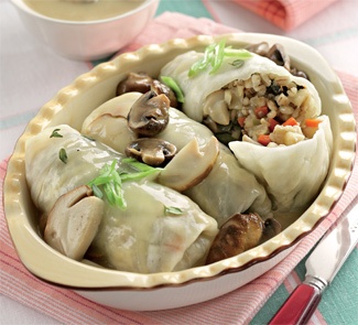 Капустные листья разложите на поверхности стола, в центр каждого поместите по 1–2 ст. л. начинки (в зависимости от размера листа) и сверните конвертом. Уложите в пароварку и готовьте 15–20 мин.