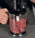 Мясо вымыть, обсушить и нарезать произвольными кусками. С помощью измельчителя превратить в фарш.