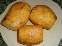 Когда картофель готов, дайте ему немного остыть, срежьте тонким слоем поджаренную корочку сверху и ложкой выньте серединку.