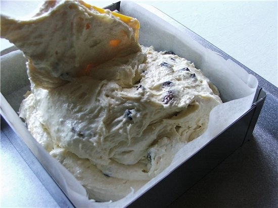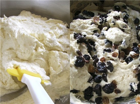 Добавить весь изюм и лопаткой перемешать до равномерности.