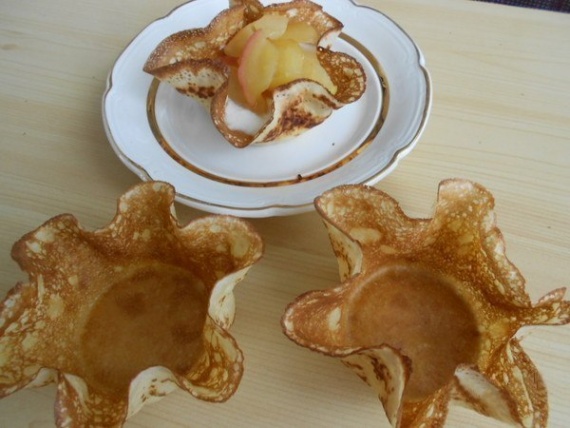Готовим тесто для блинов, по вашему любимому рецепту. Выпекаем тоненькие небольшие блинчики, чем тоньше, тем лучше. Теперь самое интересное — готовим корзинки.