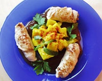 Рецепт приготовления рулетов из курицы с изюмом и яблочным гарниром.