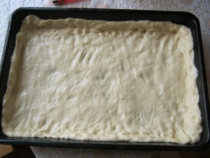 Пока начинка остывает, мы распределяем тесто на противне, я это делаю руками. Можно скалкой, кому как удобно.