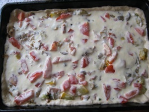 Замесите тесто из дрожжей, воды, муки, соли и растительного масла. И поставте его в теплое место где-то на 1 час.