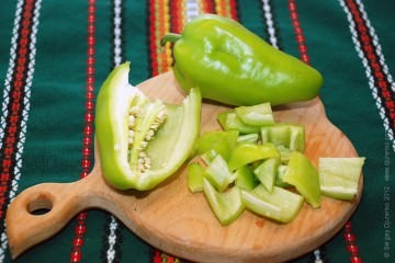 Сладкий перец — любой. Желтый, красный, зеленый. Очистить от семян и плодоножек и нарезать на достаточно крупные ломтики.