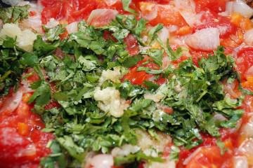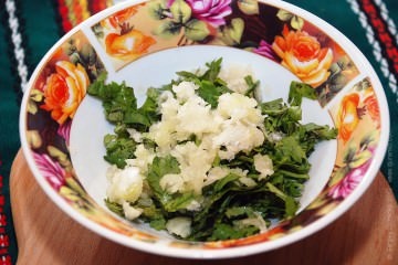 Зелень кинзы измельчить и смешать с растолченным в ступке чесноком.