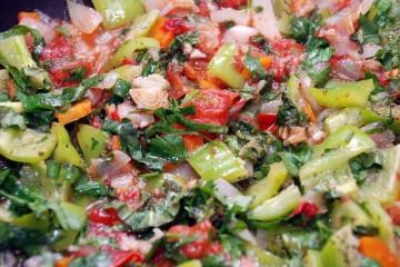Добавить к овощам кинзу с чесноком и продолжать тушить еще 10 минут.