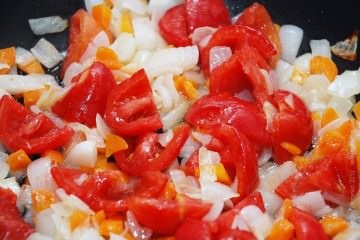 Помидоры должны быть очень спелые, самые красные. Помидоры ошпарить кипятком и обдать холодной водой. Разрезать помидоры поперек на две части. Очистить кожицу помидоров и удалит семена. Если помидоры не очень крупные, их можно больше не резать, а оставить как есть. При готовке они в любом случае потеряют форму и превратятся в томатный соус.