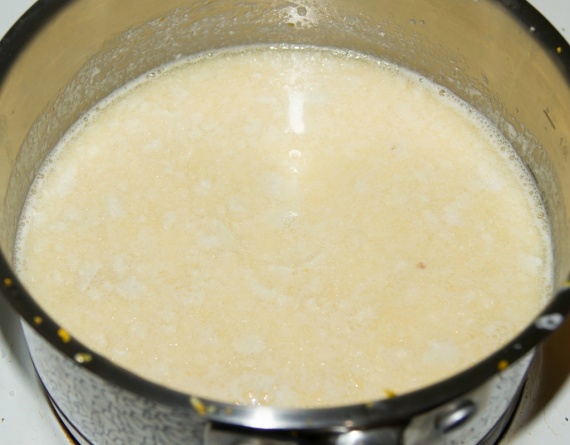 3. Имбирь измельчить. Влить в сотейник кокосовое молоко, добавить в него имбирь. На небольшом огне нагреть молоко, не доводя до кипения. Снять с огня, вбить желтки, приправить солью, соком и цедрой лайма, хорошо перемешать.