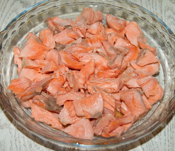 2. Филе форели положить в кипящую воду, довести на сильном огне до кипения и сразу же снять с огня. Выложить рыбу шумовкой на блюдо, дать слегка остыть, после чего разобрать на небольшие кусочки.