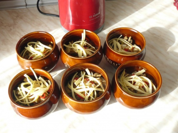 Мясо и грибы с луком разложить в 6 глиняных горшочков, сверху положить несколько колечек красного горького перца