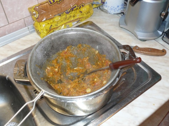Затем соус процедить и протереть через сито разварившиеся овощи.