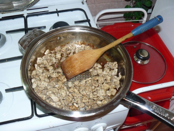 вынуть из бульона, и обжарить с луком, нашинкованным полукольцами.