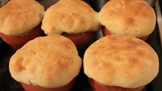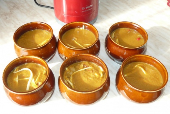 Каждый горшочек закрыть сверху слойкой, которая готовится в самый последний момент, и обжать её вокруг горловины горшочка. Запекать в духовке 20-30 минут при температуре 190 градусов. При этом не открывайте дверцу духовки, чтобы тесто не опало.