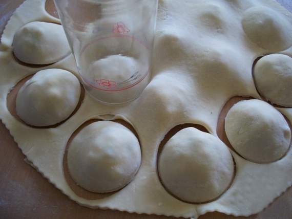 Cтаканом подходящего диаметра вырезать пирожки по контурам каждого кружочка помидора, так поступаем со всеми пирожками.