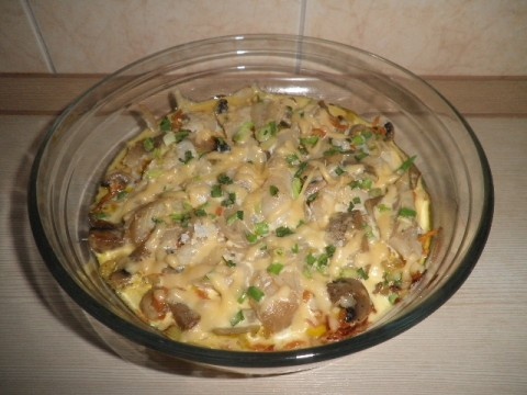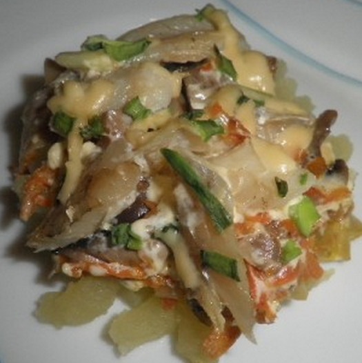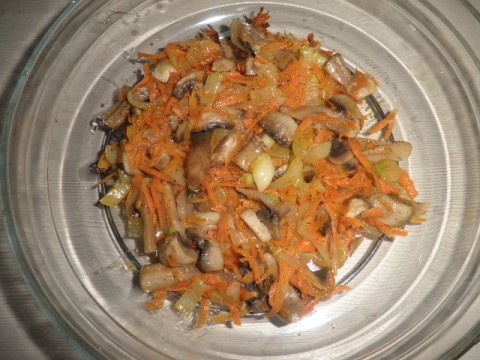 Пока рыба стынет, тушим на растительном масле овощи своим любимым методом. Овощи можно использовать различные, я выбрала лук репчатый, морковь, перец, грибы. Тушенные овощи кладем в посуду, пригодную для духовки ( у меня термостойкая стеклокерамическая).