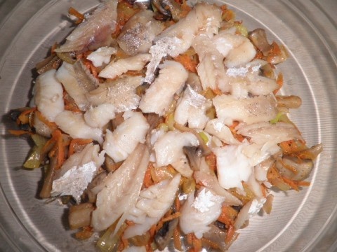 Отделяем рыбу от костей и укладываем сверху на подготовленные овощи.