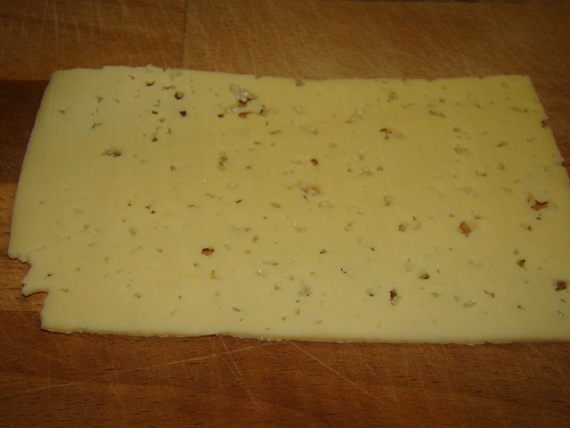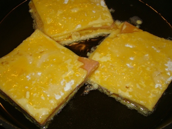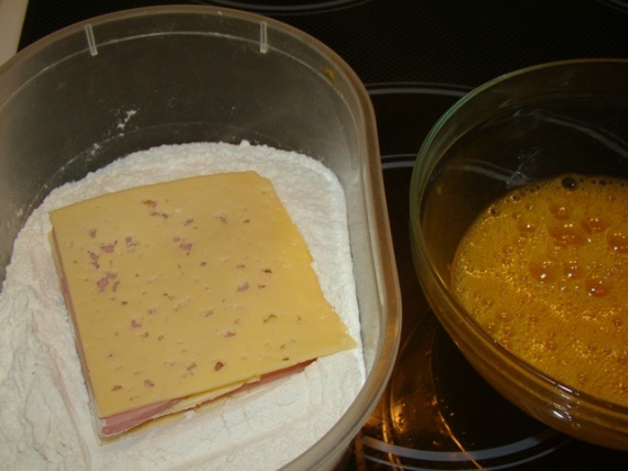 Ломтик очень холодного (прямо из холодильника) твердого сыра толщиной в 1 см обвалять в муке, затем обильно в яйце, щедро панировать в пшеничных сухарях или в тонко нарезанных полосках свежего белого хлеба (панировки должно быть много). Кратко обжарить по разу с каждой стороны на предварительно хорошо разогретой сковороде с маслом.