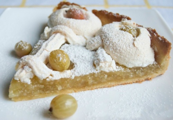 3. На посыпанной мукой доске раскатать тесто до толщины 2 мм, выложить в форму диаметром 26 см со съемными бортиками, сформировать край высотой 3 см. Тесто наколоть несколько раз вилкой и по всей поверхности уложить на него бумагу для выпекания. Заполнить форму до верхнего края сухим горохом и поставить в холодильник на 30 минут.4. Выпекать корж до полуготовности в предварительно нагретой до 200 градусов духовке в течение 10 минут, после чего удалить сухой горох и бумагу.5. Вымыть крыжовник, очистить от веточек. Приготовить сахарный сироп. Добавить в него ягоды и варить на слабом огне 15 минут. Для украшения вынуть 15 ягод из кастрюли за 5 минут до окончания варки. Остальные ягоды протереть через сито. Сок еще раз проварить. Развести крахмал небольшим количеством холодной воды и соединить с соком крыжовника. Немного остудить.