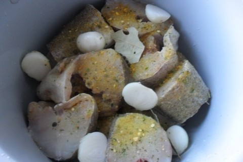 Берем треску, чистим, режем на порционные куски, складываем в чашу мультиварки или другую посуду, посыпаем специями, солью, луком, перемешиваем и оставляем на 30 мин.