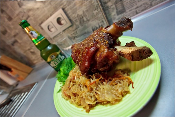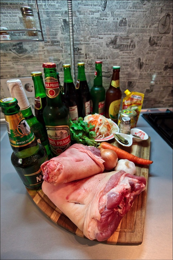 Готовить мы сегодня будем «Вепрево колено» в темном пиве, запеченное с квашеной капустой, или просто Рульку…