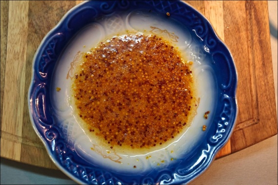 Смешать мёд, горчицу и 2 столовых ложки пивного бульона из кастрюли с рулькой.