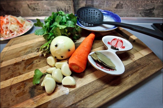 Далее готовим овощи со специями. Репчатый лук чистим, моем, втыкаем в него гвоздички. Морковь чистим, моем, режем крупно. Корень сельдерея моем и режем крупно. У нас корня не было, поэтому использовался плотно связанный пучок сельдереевого бурьяна, который растет над землей. Чеснок можно использовать целиком или разделить на зубчики. Подготавливаем лавровый лист, перец, соль и тмин.