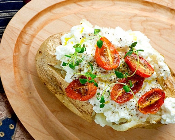 Раскрываем картофель (можно пополам, можно крест-накрест). Сверху укладываем сыр рикотта, жареные помидоры. Можно также сверху посыпать свежей рубленной зеленью.