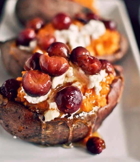 Сладкий картофель, фаршированный жареным виноградом, козьим сыром и мёдом