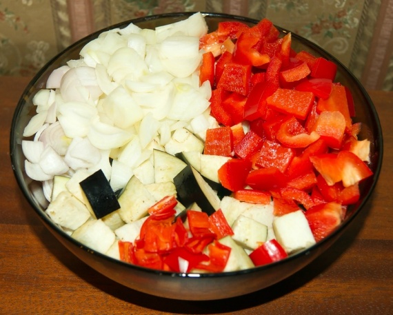 1. Перцы (сладкий и острый) очистить от семян. Баклажан, цукини, перцы и лук нарезать небольшими кубиками.