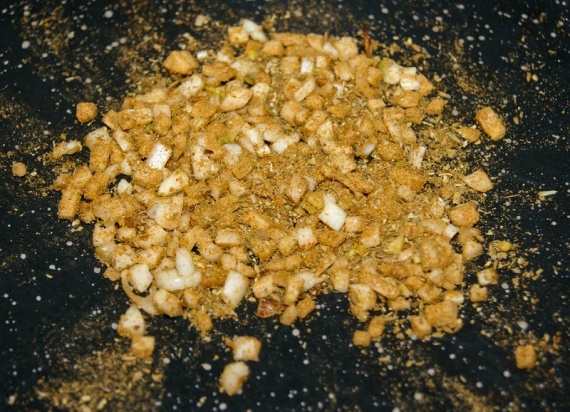 3. Измельчить чеснок, всыпать его в разогретую сухую сковороду вместе с зирой, сушеным орегано и молотым чили, готовить 30 сек.