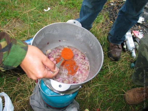 Когда лук приобретет золотистый оттенок, наступает кульминация: в кипящую зажарку, постоянно помешивая, кидаем примерно 2 столовых ложки с верхом сладкого молотого красного перца. (паприка).