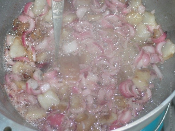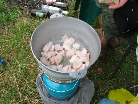 Потом мелко нарезаем его и обжариваем в вытопленном сале.