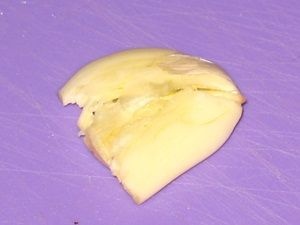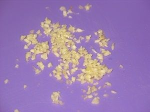 Предварительно почистить чеснок. Раздавить его плоской стороной ножа и мелко нарубить. Подобный способ измельчения используется для того, чтобы не выдавить чесночный сок, а сохранить его внутри.