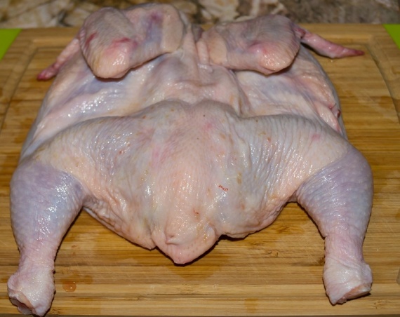 1. Цыпленка вымыть, обсушить. Разрезать вдоль грудной кости, которую при желании можно удалить (без неё цыпленок будет прожариваться равномернее), раскрыть как книгу, положить на доску спинкой вверх и хорошо расплющить руками, сильно придавливая до похрустывания вдоль линии хребта. Натереть тушку солью и чёрным перцем.