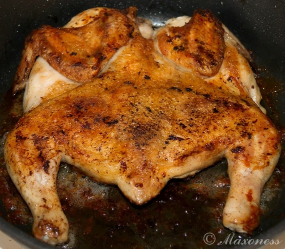 2. В большой сковороде с толстым дном, в которой уместится весь цыплёнок, растопить сливочное масло (не нужно класть масла больше нужного количества, иначе оно сгорит и всё будет на цыпленке), после чего уложить цыплёнка спинкой вверх. Жарить на довольно сильном огне, хорошо прижимая сверху, до образования румяной корочки, около 7-8 минут.