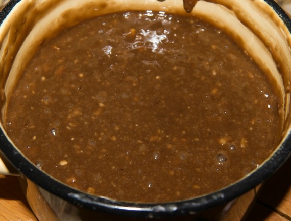 2. В процеженный кофе добавить сахар и мед. Слегка нагреть, перемешивая, до полного растворения меда и сахара.3. Снять с огня, добавить половинки грецких орехов, соду (гасить не надо!) и щепотку соли. Всыпать просеянную муку и перемешать.
