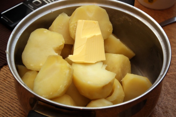 Картофель нужно очистить и сварить до мягкости в подсоленной воде. Когда он будет готов, воду нужно слить и добавить к нему хороший кусочек сливочного масла. Ингредиенты 2-го этапа: Сливочное масло 40 г Мука пшеничная 35 г Яйцо куриное 2 шт.