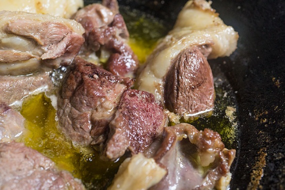 Подождите, когда поверхность мясо побелеет и только потом опускайте следующие куски — так образуется гораздо меньше пены.