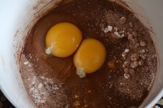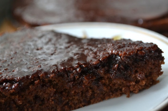 Когда пирог готов откладываем его в сторону для остывания. В это время делаем глазурь: смешать какао, сахарную пудру и колу. Хорошенько размешать.Сделать насечки на пироге, залить верх торта глазурью.