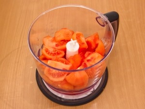 Измельчить. Если блендера нет, можно помидоры натереть на терке.