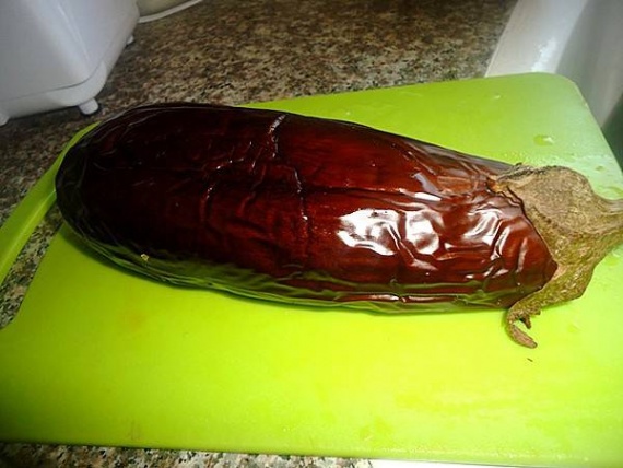 После того, как баклажан остынет, очистить его от кожицы не удаляя при этом черенок.