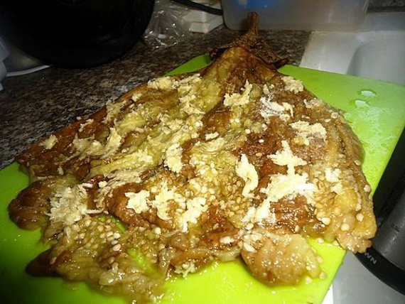 Измельчаем 3 дольки чеснока и выкладываем это великолепие поверх баклажана.