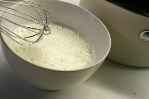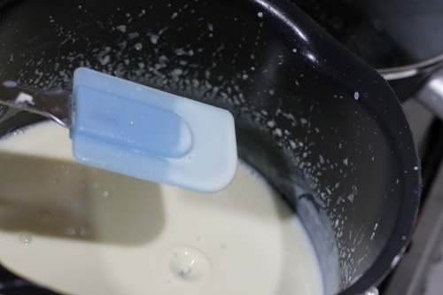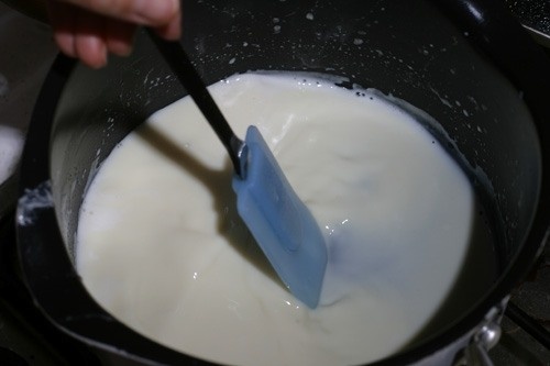Перелейте обратно в кастрюлю и варите на медленном огне, не позволяя закипать и помешивая.