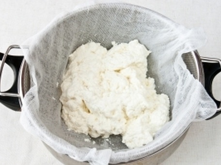 После полного разделения сыворотки и творога снять кастрюлю с огня и откинуть в марлю. Промыть его под струёй холодной воды полминуты, чтобы он стал плотнее и чтобы удалить лимонный сок, который может испортить вкус сыра.
