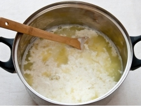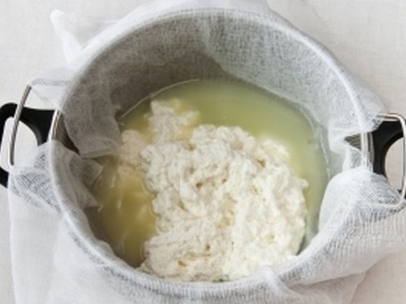 Когда молоко начнёт подниматься, добавить к нему лимонный сок. Почти сразу же сыр отделится от прозрачной сыворотки. Снять кастрюлю с огня. Если сыворотка не прозрачная, нужно поставить кастрюлю снова на огонь и добавить ещё немного лимонного сока. Нельзя держать сыр долго на плите, иначе он получится жёстким.